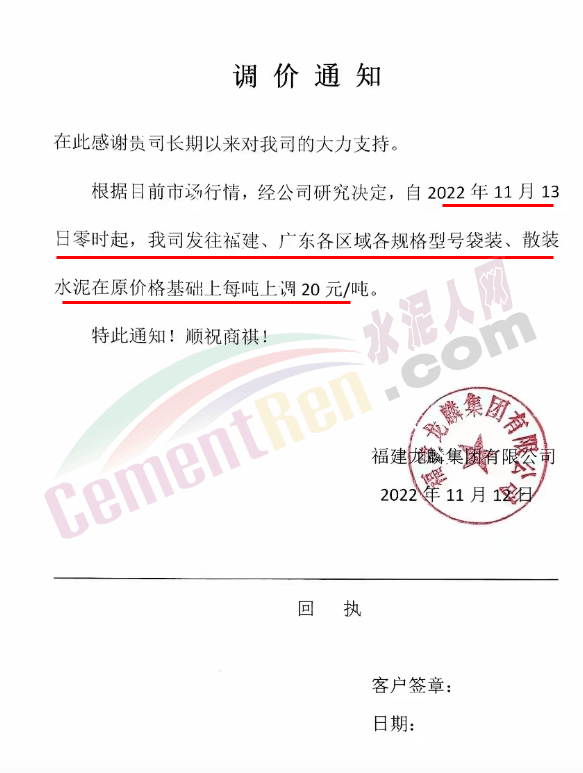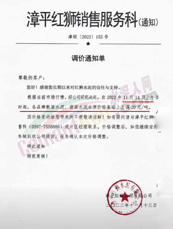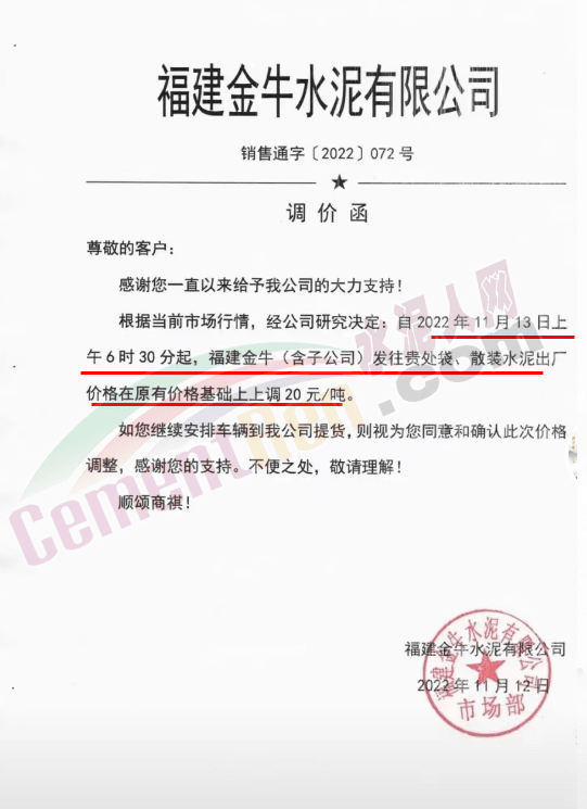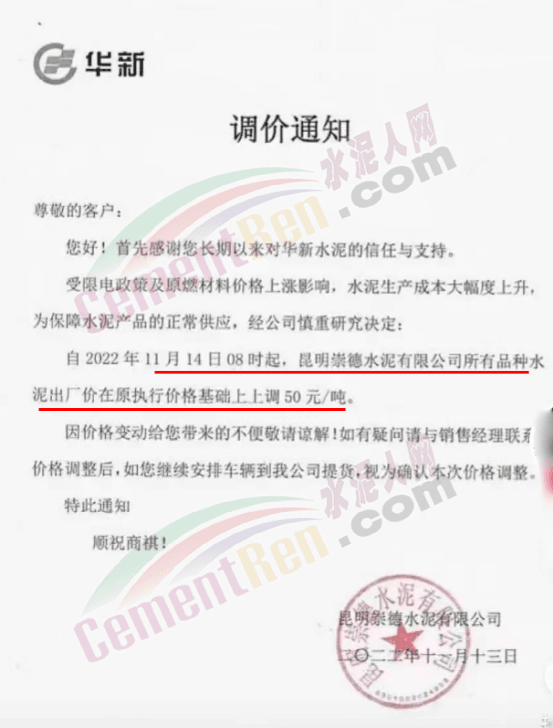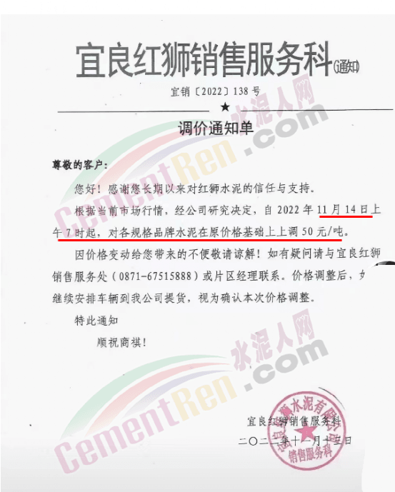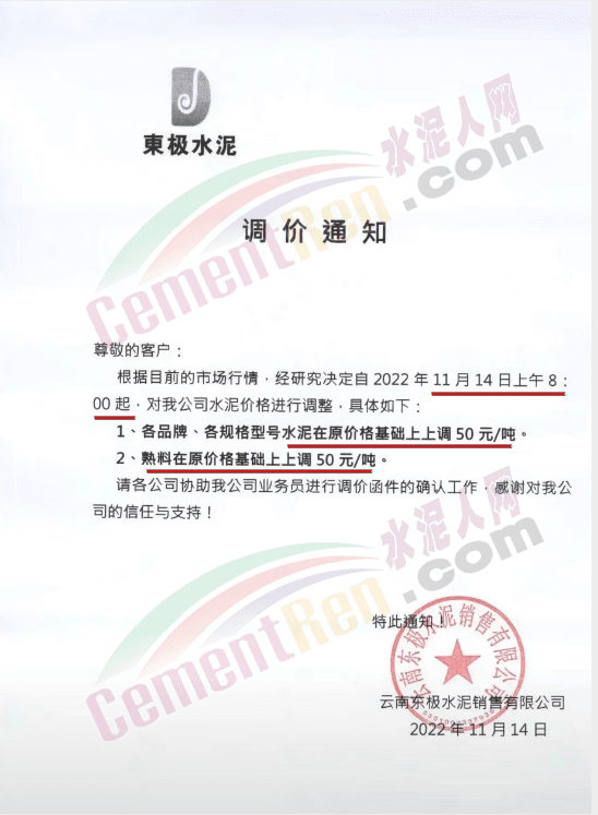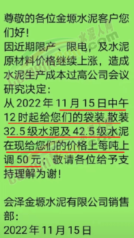 会泽金塬水泥有限公司销售部通知,因近期限产、限电,及水泥原材料价格继续上涨,造成水泥生产成本过高公司会议研究决定从2022年11月15日中午12时起给您们的袋装,散装32.5级水泥及42.5级水泥价格上调50元/吨。