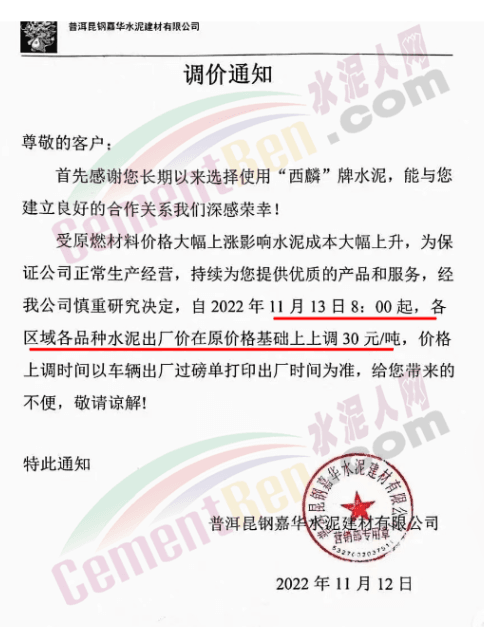 普洱昆钢嘉华水泥建材有限公司通知,自11月13日8时起,各区域各品种水泥出厂价上调30元/吨。