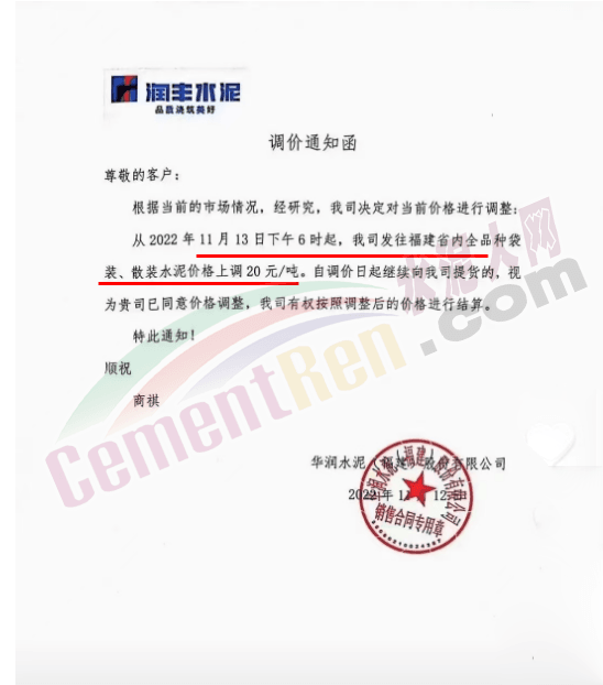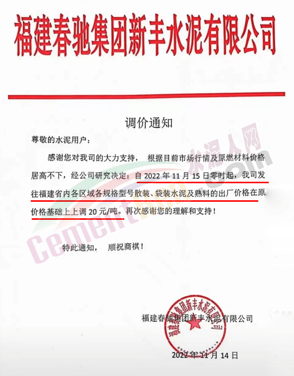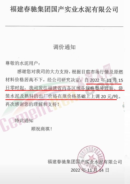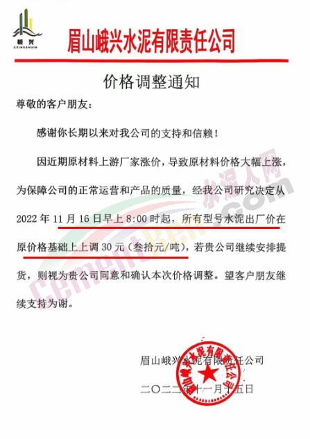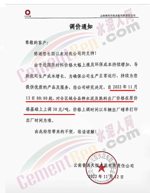 云南普洱天恒水泥有限责任公司通知,11月13日0时起,对全区域全品种水泥及熟料出厂价在原价基础上上调30元/吨。