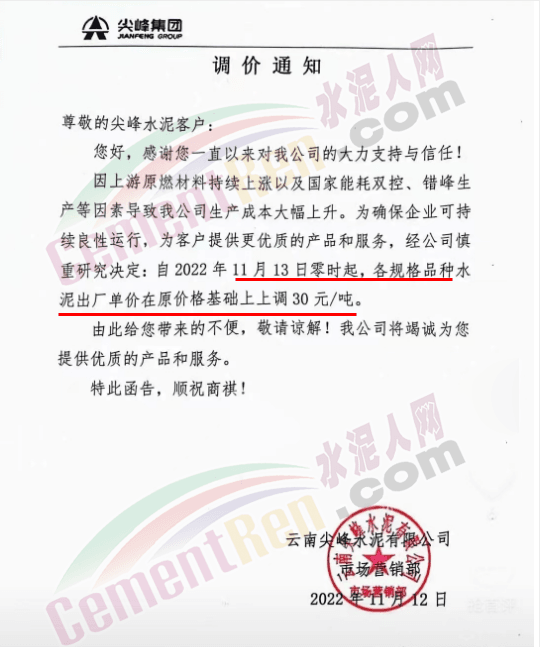 云南尖峰水泥有限公司市场营销部通知,11月13日零时起,各规格品种水泥出厂单价在原价基础上上调30元/吨。