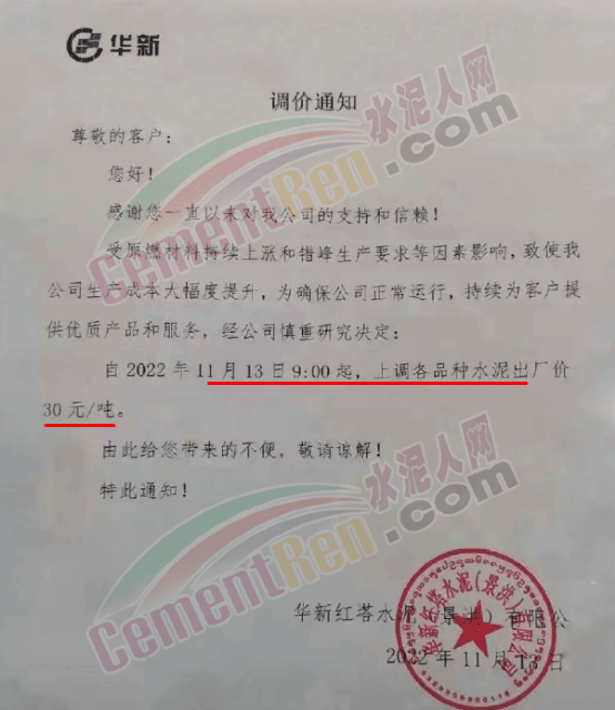 华新红塔水泥(景洪)有限公司通知,自11月13日9时起,上调各品种水泥出厂价30元/吨。