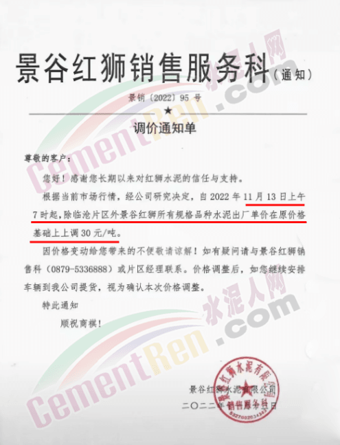 景谷红狮水泥销售服务科通知,11月13日 上午7时起,除临沧片区外景谷红狮所有规格品种水泥出厂价上调30元/吨。