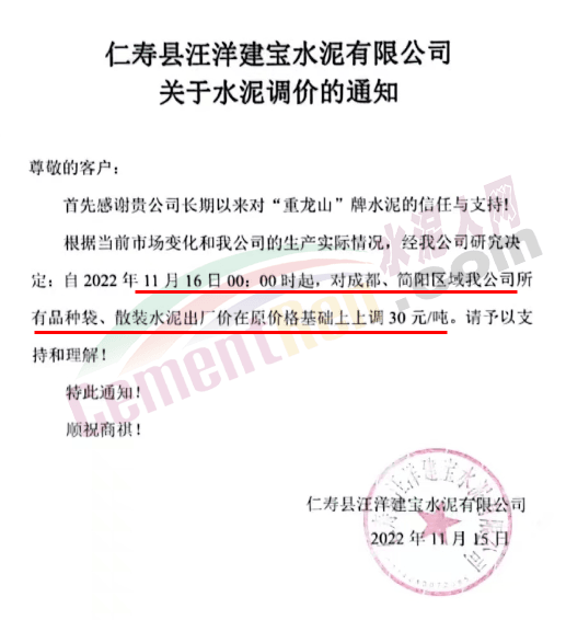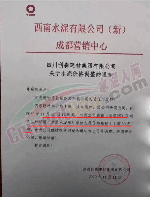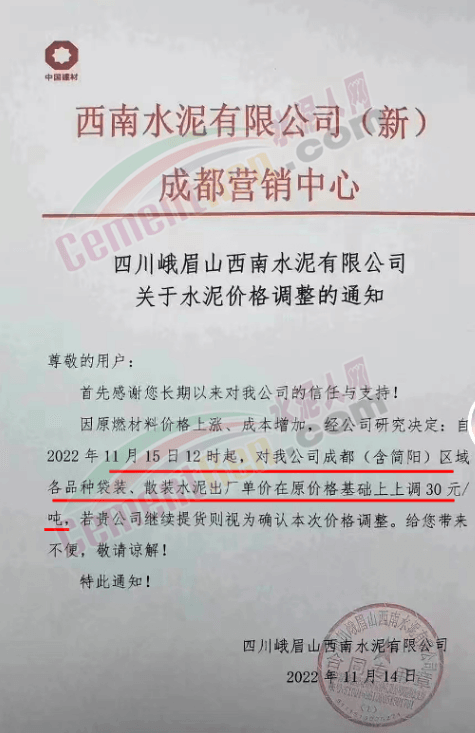 与此同时,区域内主要品牌企业通知称,因原燃材料价格上涨,成本增加,经研究决定成都(含简阳)区域水泥价格上调30元/吨。
