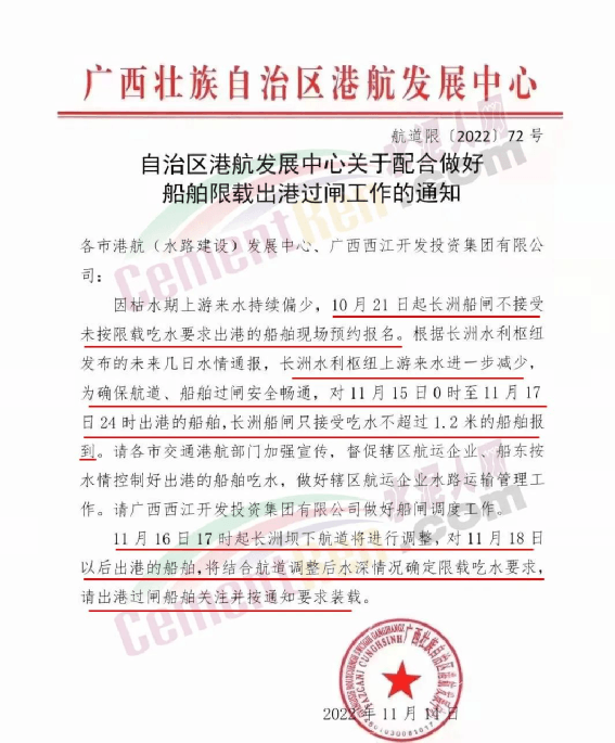 根据长洲水利枢纽发布的未来几日水情通报,长洲水利枢纽上游来水进一步减少,为确保航道、船舶过闸安全畅通,对11月15日0时至11月17 日24时出港的船舶,长洲船闸只接受吃水不超过1.2米的船舶报到。11月16日17时起长洲坝下航道将进行调整,对11月18日以后出港的船舶,将结合航道调整后水深情况确定限载吃水要求,请出港过闸船舶关注并按通知要求装载。