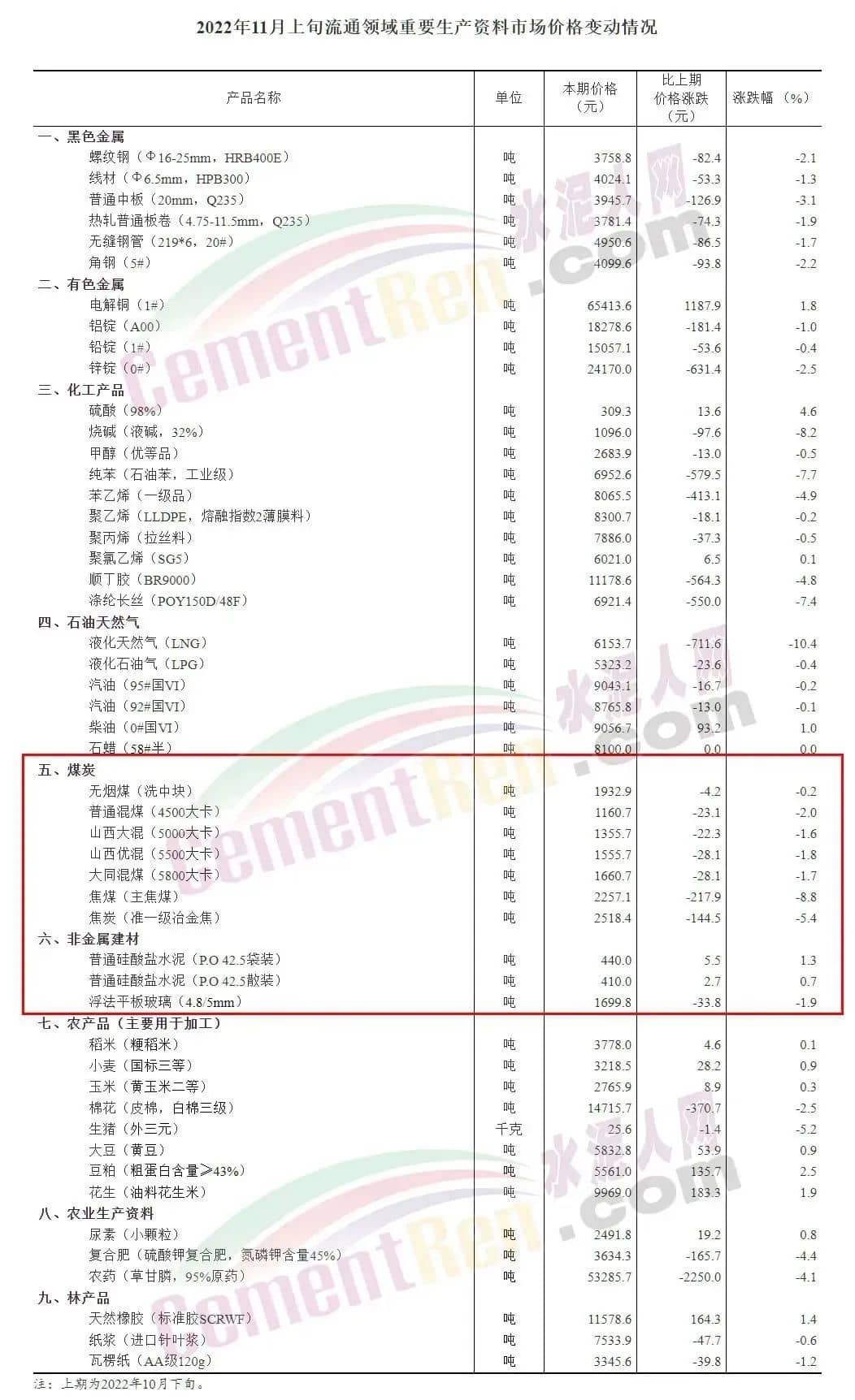综合全区域市场来看,11月14日国家统计局发布的2022年11月上旬流通领域重要生产资料市场价格变动情况显示,各品种煤炭价格出现一定的幅度的下跌,其中5000大卡山西混煤下跌2%。
