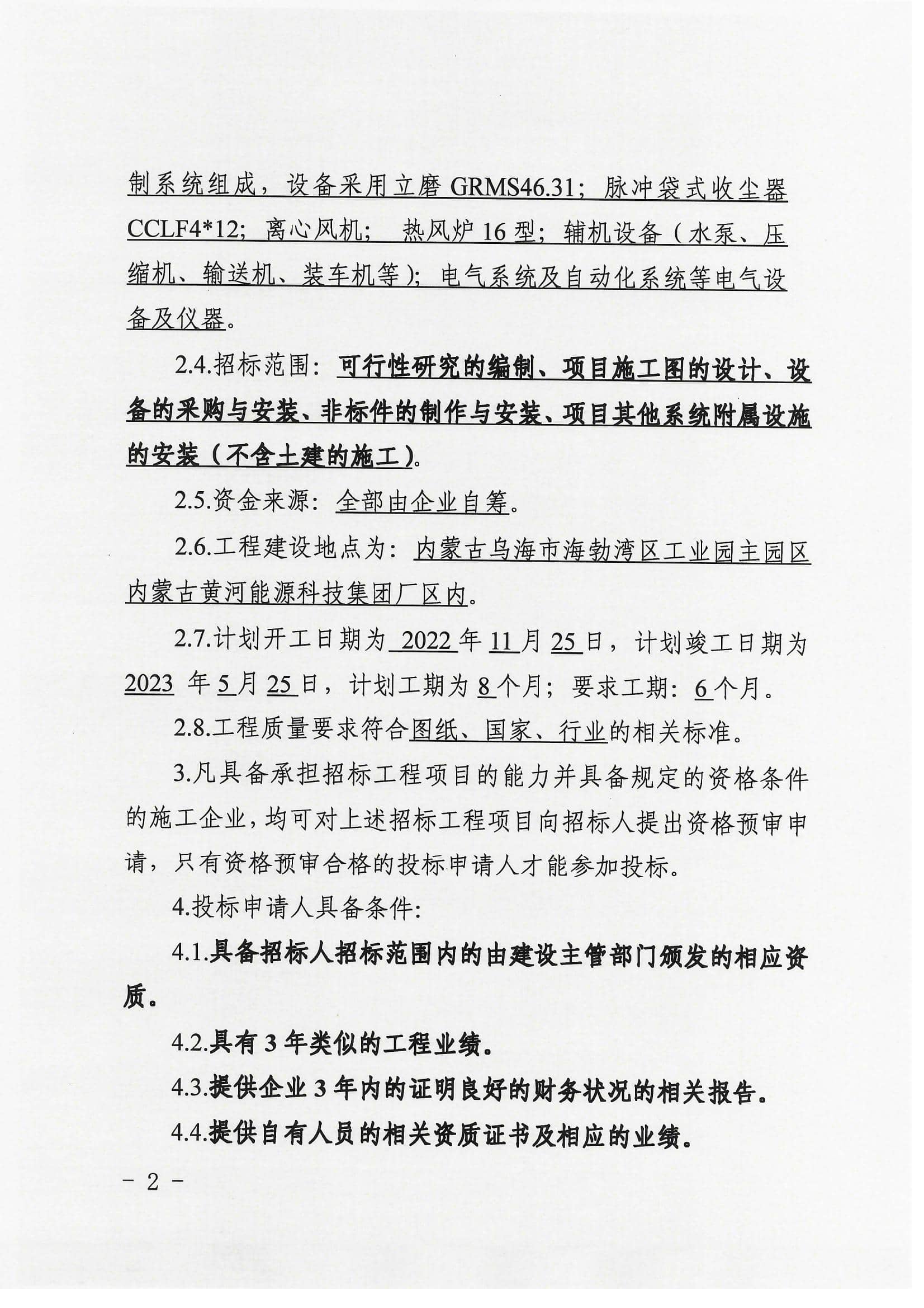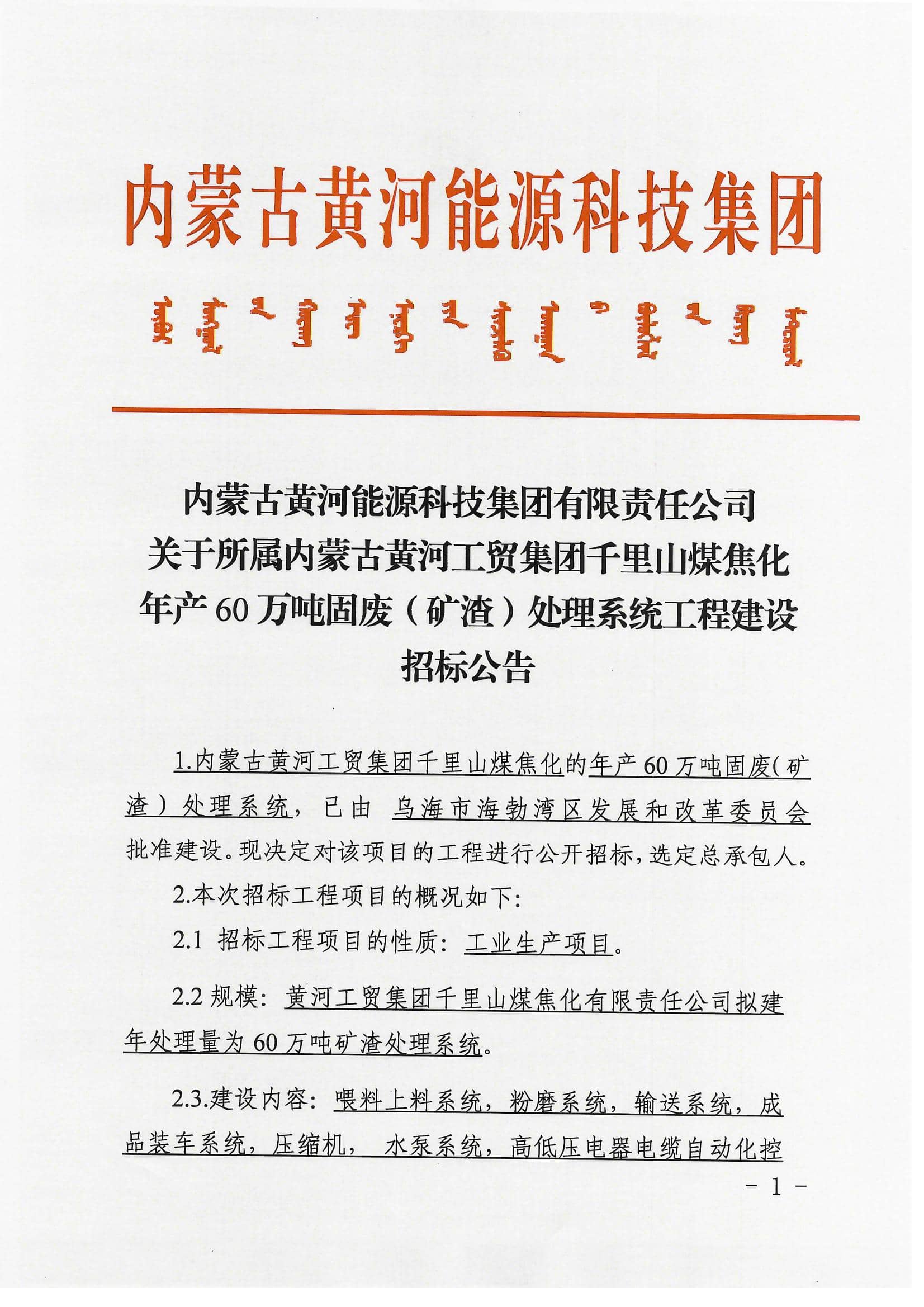 内蒙古黄河能源科技集团固废处理系统工程建设招标公告