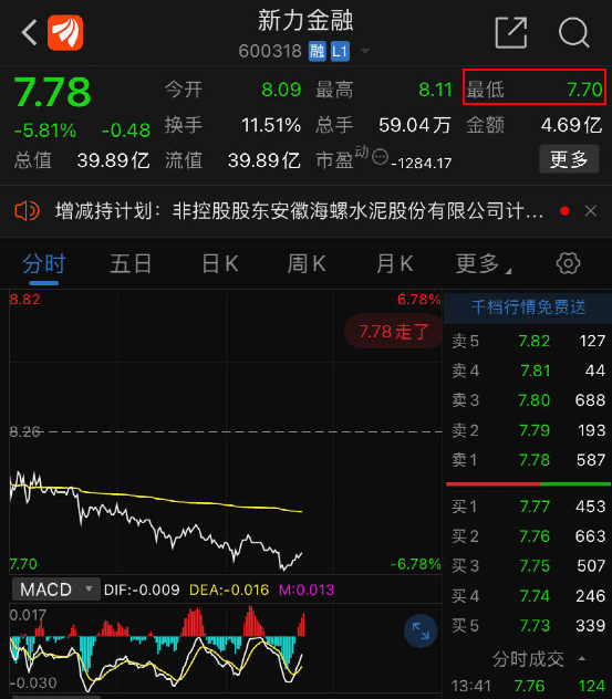 16日新力金融股价持续下滑,盘中最低价跌止7.70元/股,下跌幅度超6%。