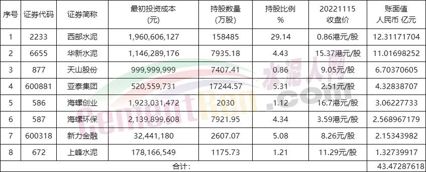 盘点海螺水泥持有的同行业股票可见,持有8家同行企业股票市值达43.47亿元,西部水泥和华新水泥账面值均达到10亿元以上。