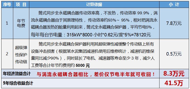 除上述性能优势外,江苏磁谷同步永磁耦合器的应用还能大大节约水泥企业生产成本,以原使用涡流永磁耦合器对比估算,按1台套平均功率315kW,每年工作8000小时进行测算,应用江苏磁谷同步永磁耦合器后预计每年可节约8.3万元,产生的经济效益十分可观。