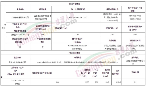 晋城山水水泥有限公司3000t/d熟料数字化智能化绿色化二代新型干法水泥带余热发电生产线补齐产能差额置换项目已于2012年3月建成投产。退出产能用于该项目的补充产能500t/d 置换后剩余产能 83.5t/d 本次置换比例2:1。