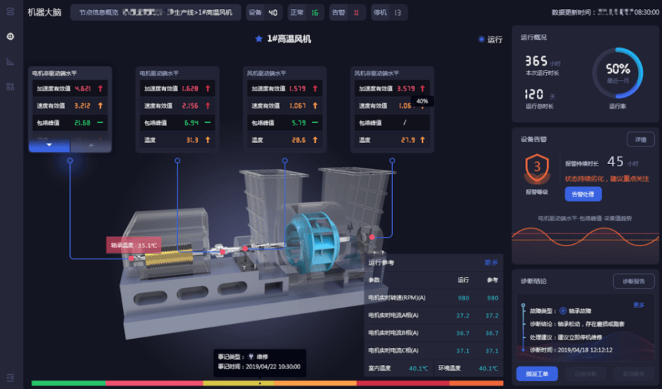 系统平台解决了维修人员经验不足、每次处理故障及产线停机维修间隔时间过长的问题。平台系统内置了故障算法模型,让故障诊断分析自动化、智能化。此模型建立在对水泥工艺流程设备机理的理解基础上,常规故障系统自诊断,并自动生成诊断报告,作为设备管理人员辅助诊断分析管理工具,大大提高了设备维修的工作效率,复杂故障由系统平台的智能诊断和远程专家诊断,双诊断模式,有力保障设备维修效率,定位设备故障部位及严重程度,减少了设备维修的时间,从而缩短设备停机时间,最大化减少因设备停机对生产任务的影响。
