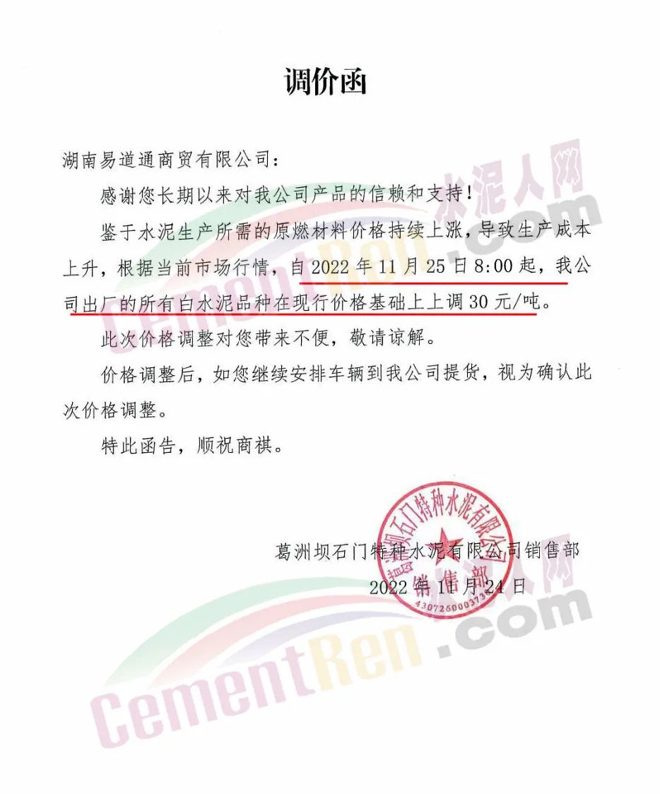 葛洲坝石门特种水泥有限公司销售部通知,鉴于水泥生产所需的原燃材料价格持续上涨,导致生产成本上升,根据目前市场行情 ,自11月25日8时起,公司出厂的白水泥品种在现行价格基础上上调30元/吨。