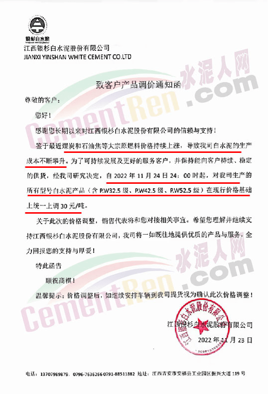 江西银杉白水泥股份有限公司通知,鉴于最近煤炭和石油焦等大宗原燃料价格持续上涨,导致公司白水泥的生产成本不断攀升。为了可持续发展及更好地服务客户,并保持向客户持续,稳定的供货,经公司研究决定,自11月24日24时起,对公司生产的所有型号白水泥在现行价格基础上统一上调30元/吨。