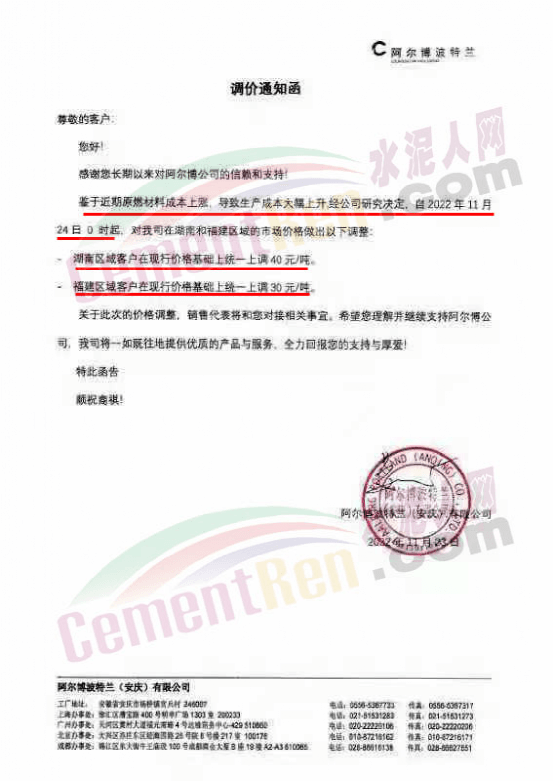 阿尔博波特兰(安庆)有限公司通知,鉴于近期原燃材料成本上涨,导致生产成本大幅上升经公司研究决定,自11月24日0时起,湖南区域在现行价格基础上统一上调40元/吨。福建区域在现行价格基础上统一上调30元/吨。