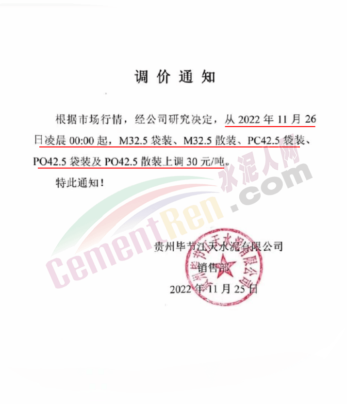 贵州毕节江天水泥有限公司通知从11月26日凌晨0时起,各标号水泥上调30元/吨。
