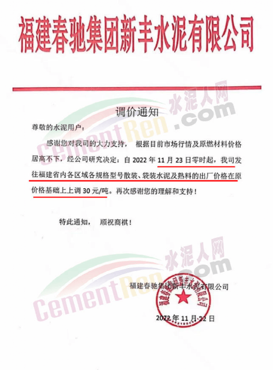 同期,福建春驰集团新丰水泥通知根据目前市场行情 及原燃材料价格居高不下,经公司研究决定,自11月23日0时起公司发往福建省各区域各规格型号水泥及熟料出厂价在原基础上上调30元/吨。