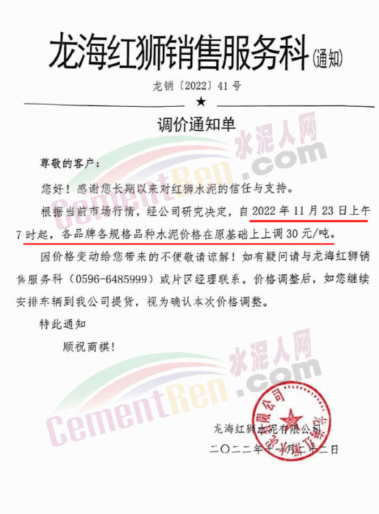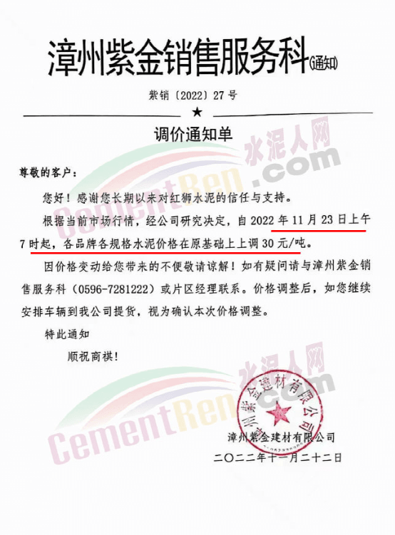 漳州紫金建材、龙海红狮水泥通知,根据当前市场行情,经公司研究决定,自11月23日上午7时起,各品种各规格水泥价格在原基础上上调30元/吨。