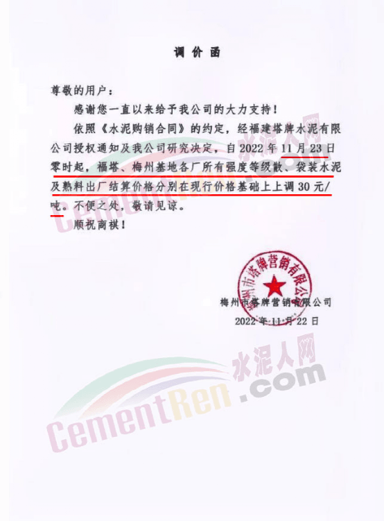 梅州市塔牌营销有限公司通知自11月23日零时起,福塔、梅州基地各厂所有强度等级水泥及熟料出厂结算价分别在现行价格基础上上调30元/吨。