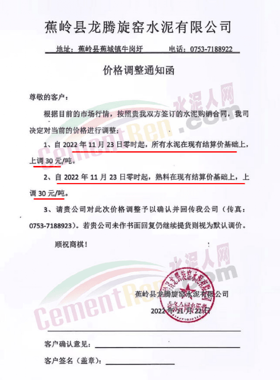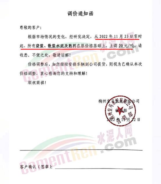 梅州皇马水泥通知,11月23日零时起,所有水泥及熟料在原价基础上上调30元/吨。