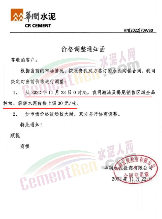 华润水泥投资有限公司通知自11月23日0时起,公司潮汕及揭尾销售区域全品种水泥上调30元/吨。