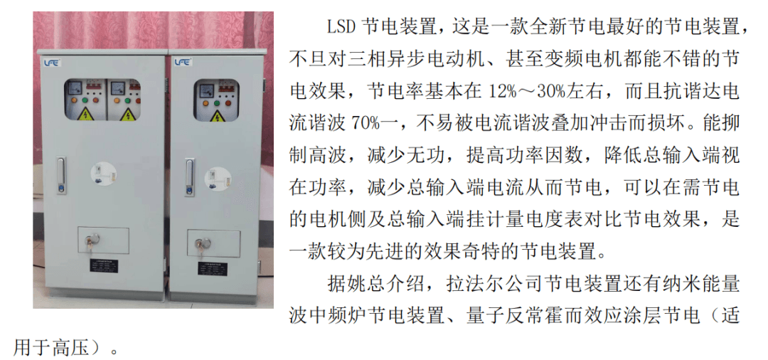 目前已有较多企业三相异步动力及带有变频装置的电机上安装上了LSD节电装置,如水泵、风机等,(节电效果对比均可以电度表为准)为较多企业节约了可观的浪费电能。
