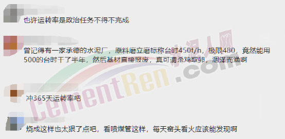 有网友提到承德的一家水泥厂原料磨立磨标称台时450t/h,极限480t/h,实际达到500t/h,半年后基材直接报废,此举可谓杀鸡取卵,涸泽而渔。也有网友表示,“运转率任务不得不完成”,“冲365天运转率”;还有网友表示,“看喷煤管这样,每天窑头看火应该能发现”。可见,这是企业相关人员明知设备出现问题却依然坚持带病运行,以至于喷煤管“带病延年”。
