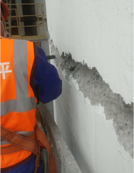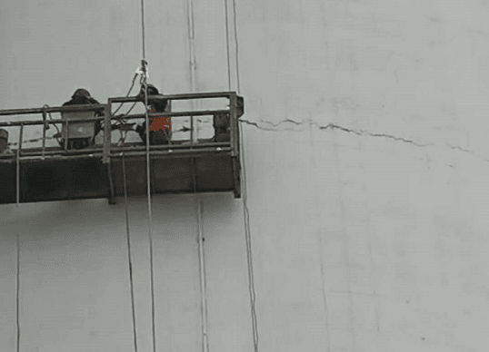 图:混凝土水泥库出现裂缝,导致水泥受潮板结严重,工人正在修复。