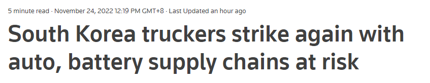 11月24日,韩国卡车司机开始罢工,他们以高油价为由,要求政府延长最低运费临时规定,这一规定将于今年年底到期。