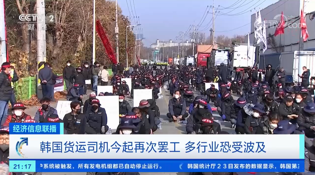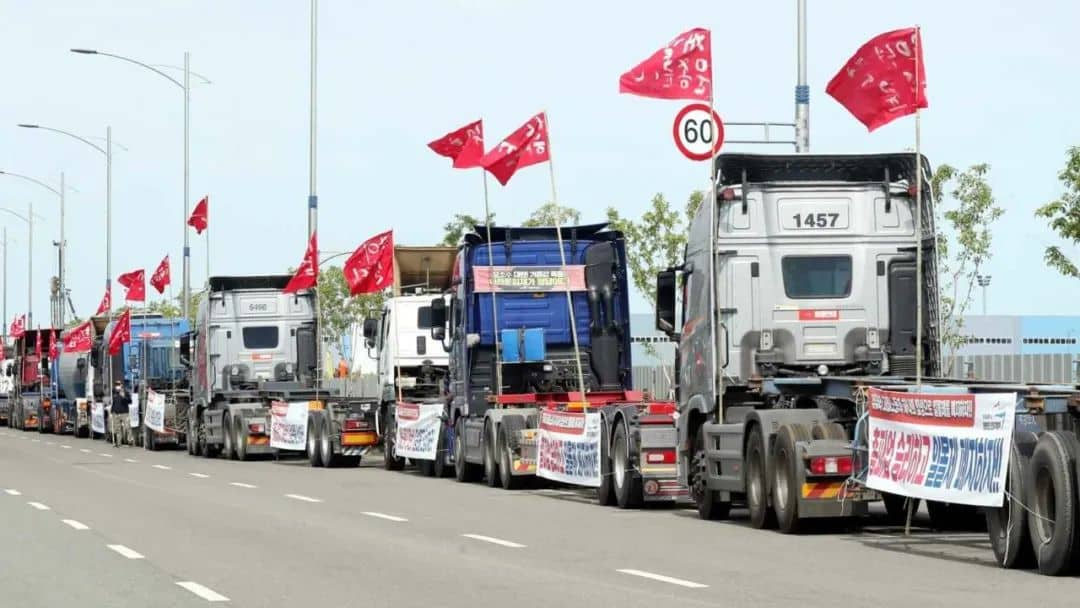 其实,早在11月14日,韩国最大的工会组织之一民主劳动组合总联盟旗下货运卡车工会(Cargo Truckers Solidarity)就宣布,将从11月23日午夜开始发动无限期罢工,大约2.5万多名工会成员将通过封锁钢铁、水泥、造船设备、汽车零部件等主要物流基地以及拒绝货物运输等方式参加罢工。