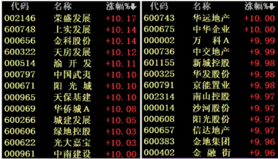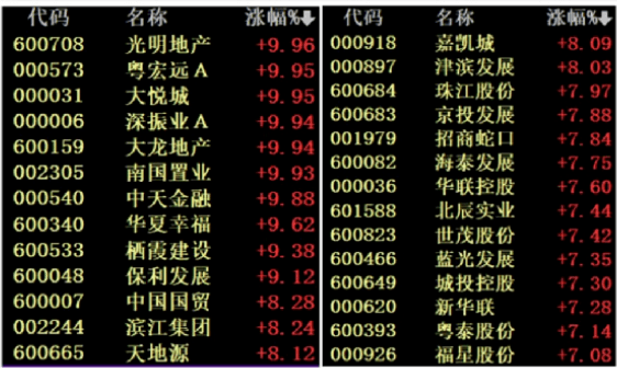 房地产板块掀起“涨停潮”,中交地产、中国武夷4连板,天房发展、渝开发、卧龙地产、空港股份、城建发展、光大嘉宝、中华企业、京能置业、沙河股份、世荣兆业、阳光股份、信达地产、光明地产、深振业A、大龙地产、南国置业竞价涨停。港股方面,多只内房股盘中涨超20%。