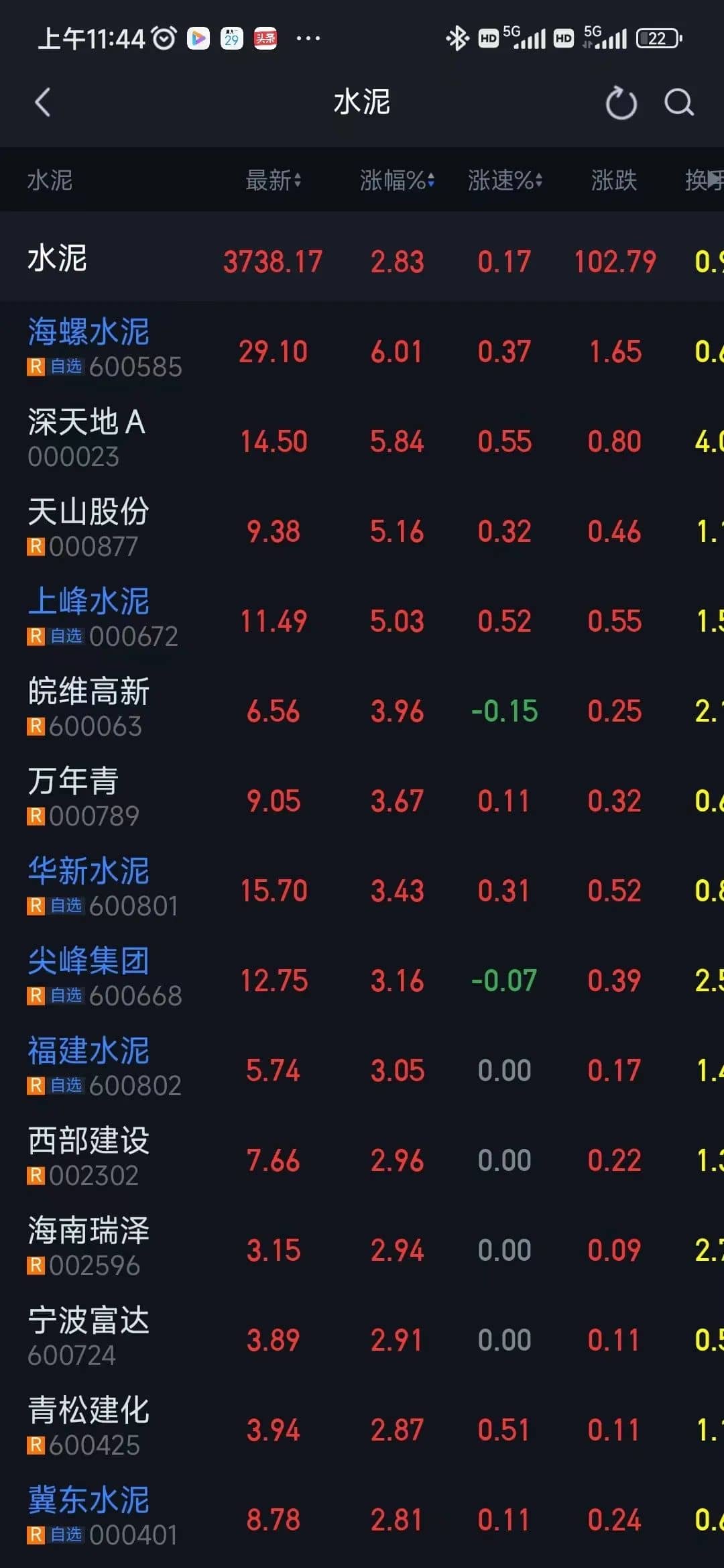 同时,水泥股早盘集体上涨,中国建材(03323)涨3.62%,报6.59港元;海螺水泥(00914)涨3.02%,报27.25港元;华新水泥(06655)涨2.84%,报7.96港元;华润水泥控股(01313)涨2.56%,报4.01港元。A股水泥板块也集体飘红。
