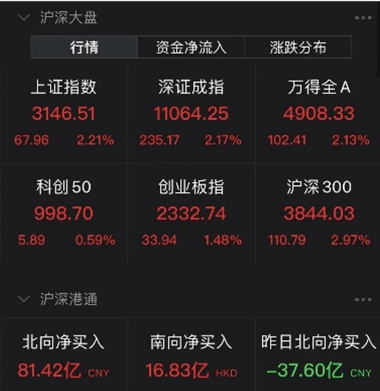 截至上午收盘,上证指数上涨2.21%,深证成指上涨2.17%,创业板指上涨1.48%。北向资金净流入81.42亿元。港股也暴涨,恒生科技指数上午收盘大涨5.45%,重回3600点,恒指、国指分别涨3.85%和4.72%。富时A50期指盘中涨超4%。