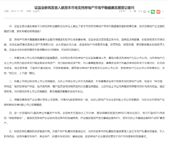 11月28日,证监会新闻发言人表示,证监会决定在股权融资方面调整优化5项措施,并自即日起施行。包括恢复涉房上市公司并购重组及配套融资、恢复上市房企和涉房上市公司再融资等,这被称为近期利好房地产行业的“第三支箭”。