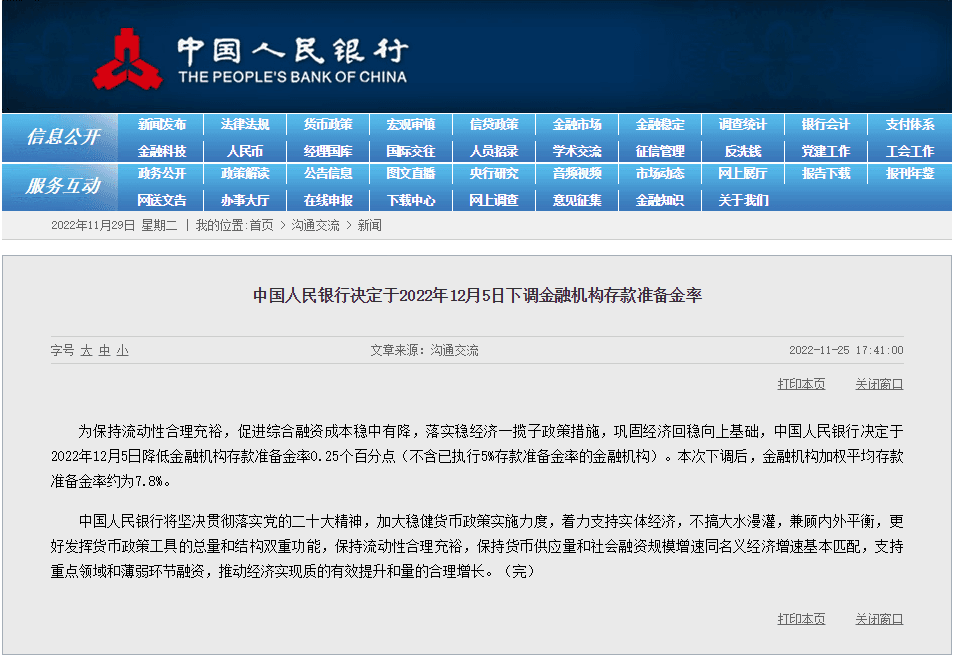 在国务院常务会议“预告”降准后,中国人民银行随即表示将于2022年12月5日降低金融机构存款准备金率0.25个百分点(不含已执行5%存款准备金率的金融机构)。本次下调后,金融机构加权平均存款准备金率约为7.8%。中国人民银行有关负责人介绍称,此次降准共计释放长期资金约5000亿元,降低金融机构资金成本每年约56亿元。