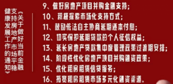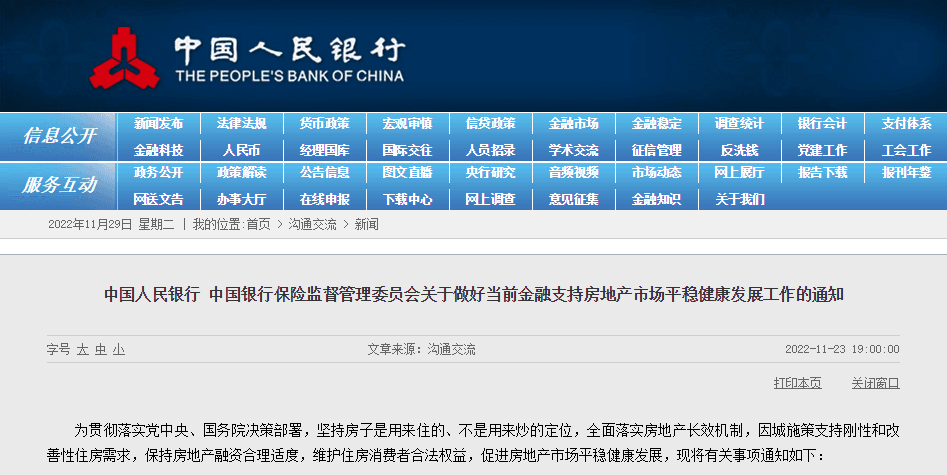 11月23日,《中国人民银行中国银行保险监督管理委员会关于做好当前金融支持房地产市场平稳健康发展工作的通知》正式发布。