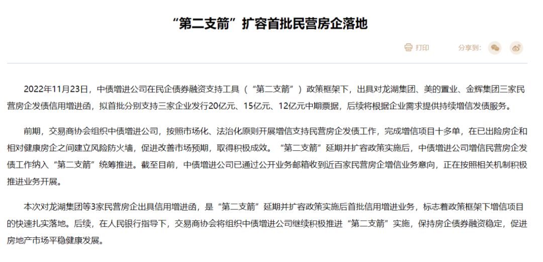 同日,中国银行间市场交易商协会发文称,已对龙湖集团、美的置业、金辉集团三家民营房企发债信用增进函,合计支持三家企业发行近50亿元的中期票据,后续将根据企业需求提供持续增信发债服务。