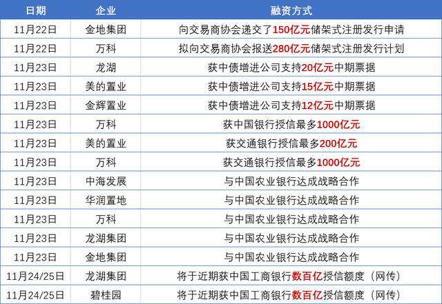 11月23日,中国银行、农业银行和交通银行先后宣布与房企签署战略合作协议,给予房企授信额度。其中,交行率先给予万科、美的置业分别1000亿、200亿授信;中国银行给万科1000亿授信;中国农业银行则一口气与中海发展、华润置地、万科集团、龙湖集团、金地集团五家房企举行了战略合作协议签约仪式。