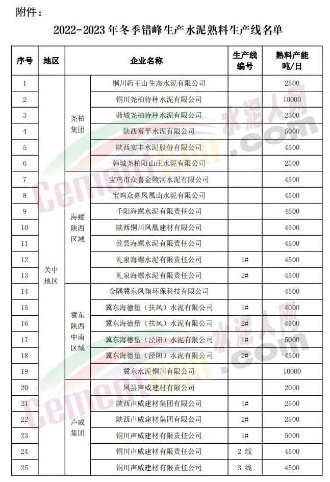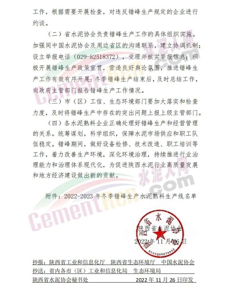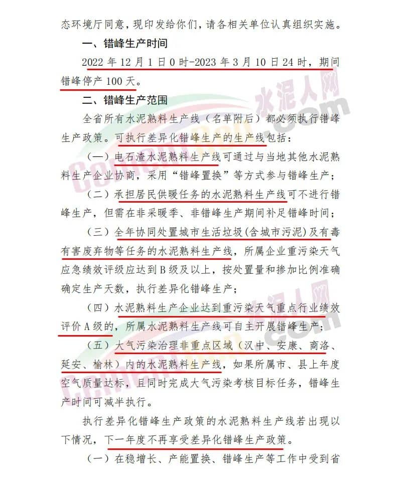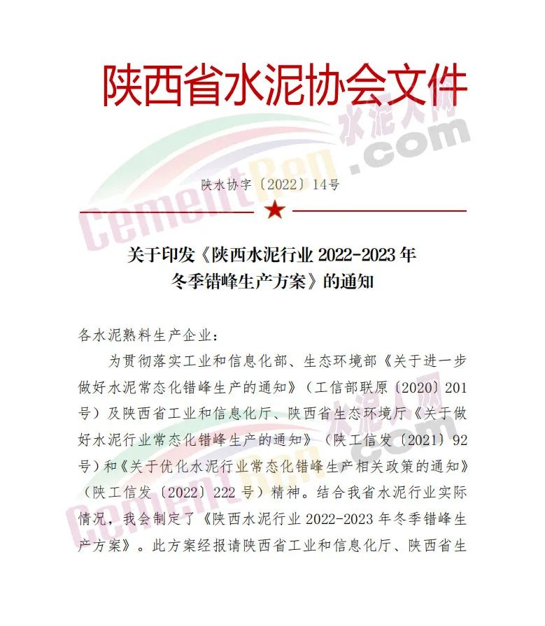 日前,陕西省水泥协会发布关于印发《陕西水泥行业2022-2023年冬季错峰生产方案》的通知,要求全省所有水泥熟料生产线2022年12月1日0 时-2023年3月10日24时,期间错峰停产100天。