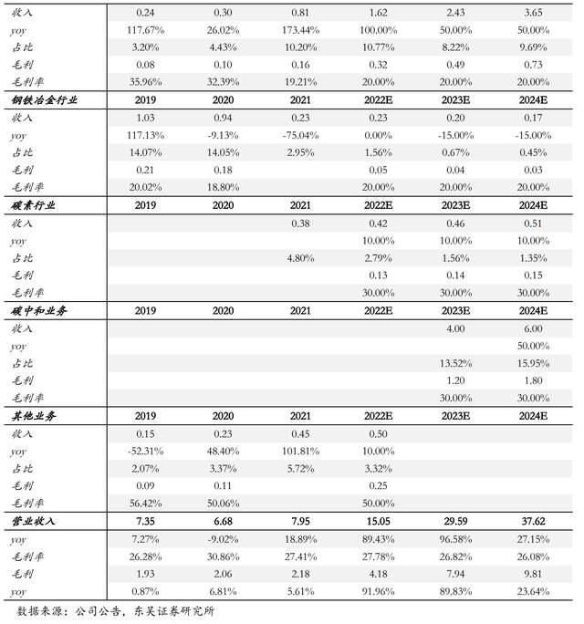占总收入比重较小,假设钢铁行业2022-2024年收入增速为0%/-15%/-15%,假设碳素行业2022-2024年收入增速为10%/10%/10%,假设汽车制造、精细化工及其他行业2022-2024年收入增速维持10%左右增速,毛利率与过去三年趋势保持一致