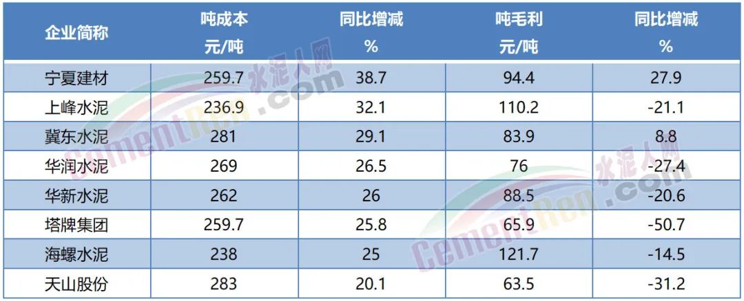 上半年煤、电成本持续高位导致水泥企业成本大幅上涨。上市公司吨成本数据中宁夏建材吨成本同比增加38.7%。
