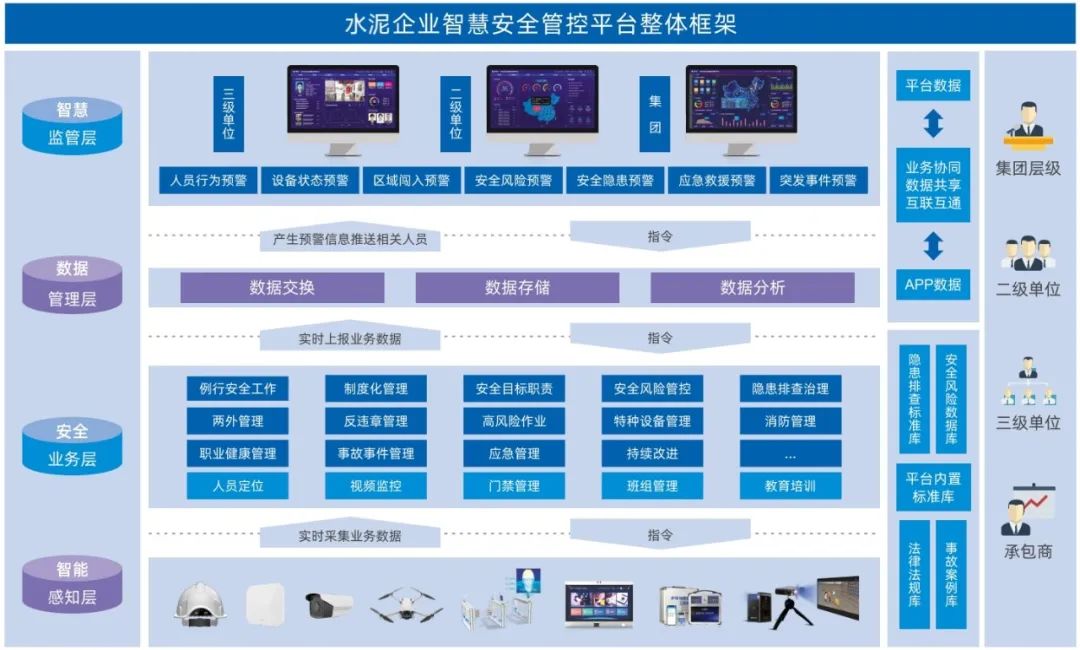 水泥企业智慧安全管控平台,以双重预防机制和安全生产标准化为核心,采用“平台+移动APP+智能终端”的创新管理模式,对企业安全风险及隐患排查等重要环节采用动态闭环式管控,协助水泥企业构建集团、二级单位、三级单位等多层级的安全管控模式,融合三维地图、人车定位、智能视频监控、智能门禁等智能软硬件设施,实现水泥企业安全工作的关口前移、精准监控、源头治理、科学预防和智能化管控,从而加强对水泥企业生产过程中安全风险进行全面有效管控。