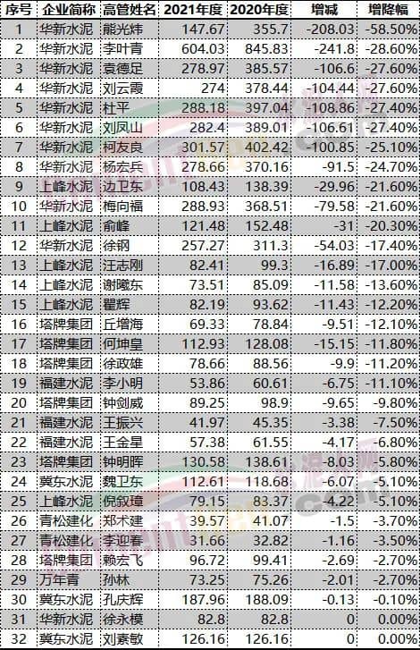 上市公司2021年财报显示,水泥行业年薪过百万的75位水泥上市公司高管中有30位薪酬下降,占比达40%。华新水泥、上峰水泥、塔牌集团、福建水泥、冀东水泥部分高管薪酬较2020年有所减少,其中华新水泥7位高管薪酬均有100万元以上的减少。