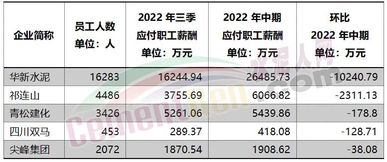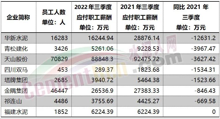 从上市公司三季度应付职工薪酬可见,华新水泥、青松建化、天山股份、四川双马来、塔牌集团、金隅集团、祁连山等七家水泥企业应付职工薪酬同比2021年三季度均有所下滑。其中华新水泥同比下滑约1.27亿元。福建水泥应付职工薪酬同比未增未减,考虑物价上涨因素,未增减也相当于“降薪”。