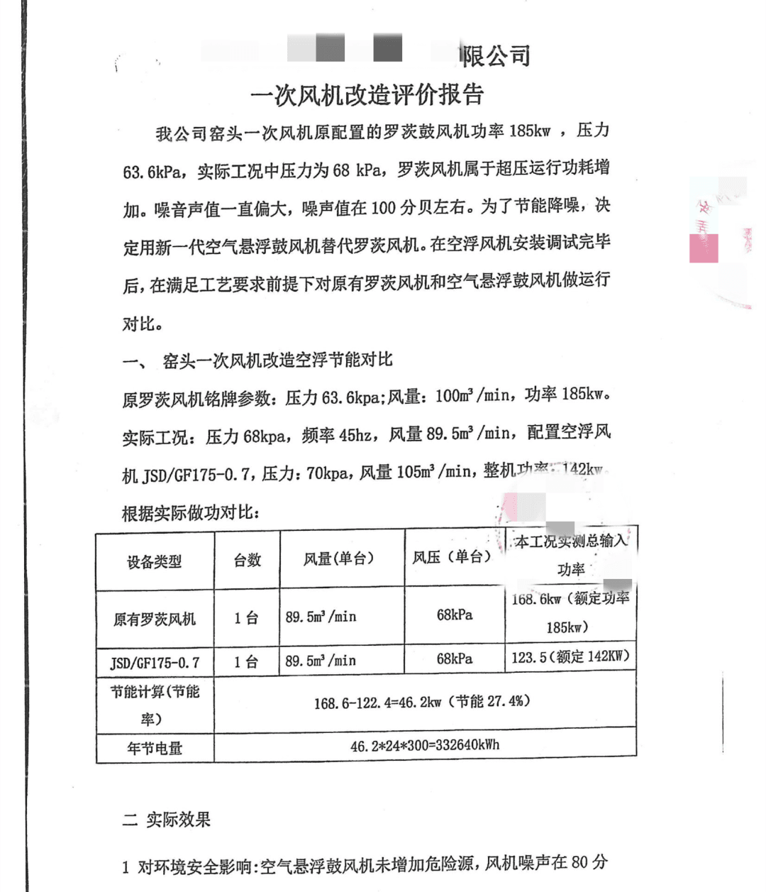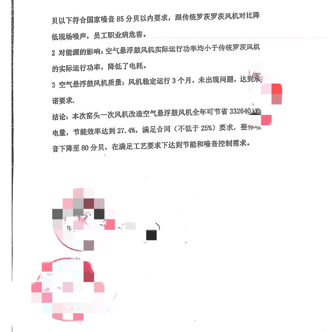 本次窑头一次风机改造空气悬浮鼓风机全年可节省332640kwh电量,节能效率达到27.4%,满足合同(不低于25%)要求,整体噪音下降至80分贝,在满足工艺要求下达到了节能和噪音控制需求。改造报告如下: