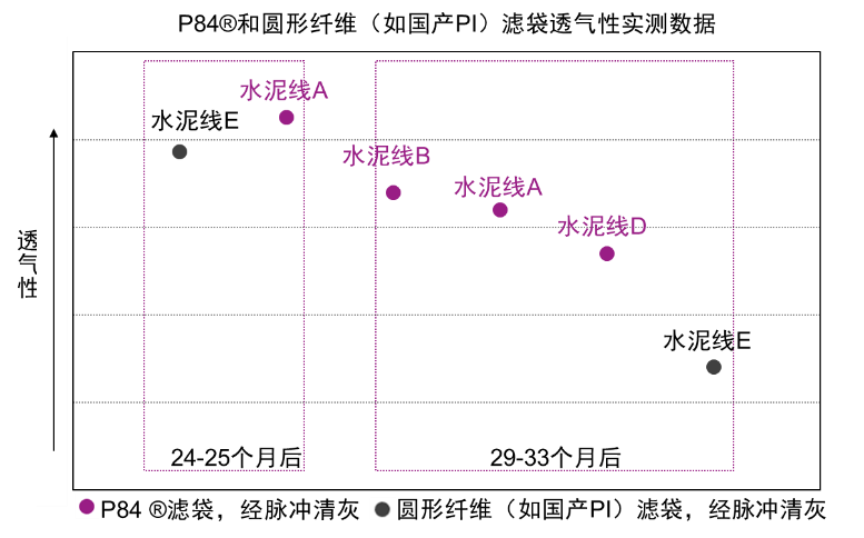 如图8所示,使用两年后的纯P84®纤维滤袋的透气性高7%,随着使用时间的增加,圆形纤维(如国产PI)滤袋的内部逐渐被粉尘堵塞,而纯P84®纤维滤袋可有效阻止粉尘进入内部,使用3年后纯P84®纤维滤袋的透气性高50%。