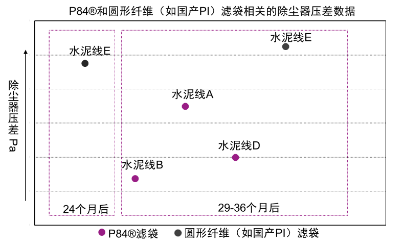 综上所述,P84®非常契合当下的超低排放、节能降耗的发展理念,得益于其卓越的过滤特性,纯P84®纤维的滤袋在全寿命周期内具有稳定、高效的粉尘捕集效率,粉尘不易进入滤袋内部,压差更低并同时降低清灰频率,不仅使滤袋的使用寿命更长,还能极大降低风机的能耗。我们推荐水泥用户在窑尾使用纯P84®滤袋,助力水泥生产线真正实现节能降本和超低排放。