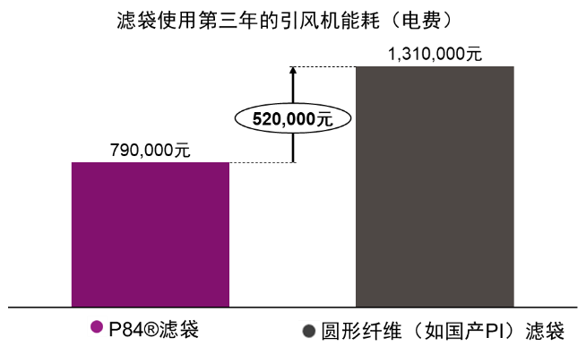 如图10所示,安装纯P84®纤维滤袋的除尘器压差更低,极大地降低引风机的运行能耗。某一实际案例中,在4年运行周期内,预计可节约100万元以上的电费。