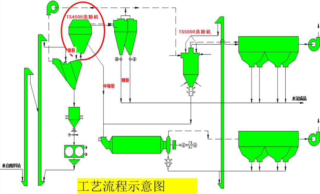 苏州天山水泥生产工艺流程配置为4.2*13M管磨机+180*120辊压机+TS4500双转笼选粉机,首先将各原材料按照一定配比通过电子皮带秤计量混合后送至配料提升机,除铁后进入循环提升机,提升至V型选粉机进行选粉,粗颗粒回恒重仓缓冲后进入辊压机中碾压,碾压挤碎后通过循环提升机带至V型选粉机,V型选粉机粗选出的较细物料进入TS4500选粉下转笼初选,200um以上的颗粒通过下转笼选粉后回恒重仓,小于200um的颗粒进入TS4500选粉机上转笼再次进行选粉,合格品通过旋风筒收集送入成品斜槽与磨机成品进行混合,不合格品进入球磨机进行粉磨,球磨机粉磨后的物料通过出磨提升机提升至TS5000选粉机选粉,合格品通过系统风机带入收尘系统收集后进入成品斜槽与TS4500成品混合,最终送入水泥库作为水泥成品储存,不合格品回球磨机进行再次粉磨。