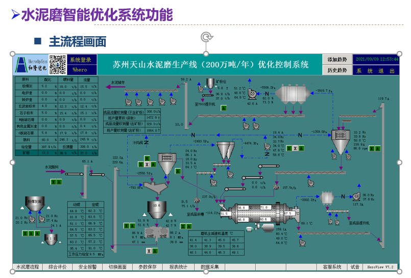 3.创造性地在水泥生产过程中采用了“自寻优”算法,结合机理模型、数据模型和专家经验三者进行变步长、变周期寻优,使系统始终运行在最佳工况,控制主界面如下图: