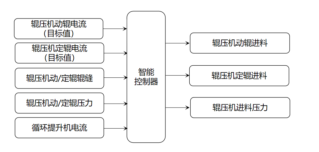 辊压机负荷控制是根据辊压机电流目标值自动调节喂料挡板,以保证辊压机电流在正常范围内。辊压机电流反映辊压机碾压物料的多少,辊压机电流不能过高。通过辊压机喂料挡板自动控制稳定辊压机滚压物料量,从而稳定辊压质量和产量,并且保证辊压机电流不超过设定限值。